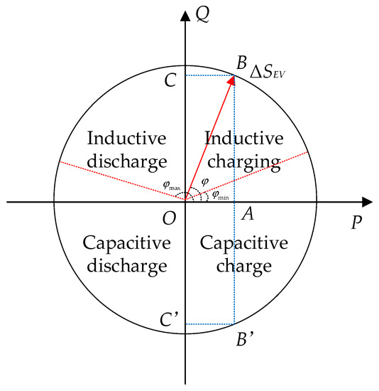 φ is the power factor angle when the apparent rated power is ΔSEV. φmin and φmax are the minimum and maximum power factor angles of the charger. The positive axis of the P axis and Q axis represents the energy transferred from the grid to the EV charger. When the active power is OA, the adjustable range of reactive power is CC’, and the length of OB is the apparent rated power ΔS. In addition, the relationship of the active and reactive power ΔPEV and ΔQEV can be charged by Figure 3, as in the Formula (12):