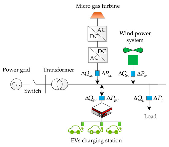 Microgrid refers to a small power generation and distribution system that is composed of distributed power sources, energy storage devices, energy conversion devices, related loads, monitoring, and protection devices. It is an autonomous system that can realize self-control, protection, and management. In addition, the microgrid can operate in grid-connected mode and islanded mode. In islanded mode, the power quality of the microgrid is usually maintained by the micro sources and flexible loads [1]. At the same time, with the development of vehicle-to-grid (V2G) technology, the research of EVs in the areas of grid peak and valley filling, suppression of power fluctuations, and microgrid stability control has also been deepened [2,3], which brings opportunities and challenges to the VF regulation of microgrids.