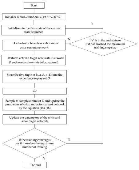 Meanwhile, the critic current network parameter ω is updated by the gratial direction of the neural network using a mean square difference loss functional Formula (15). In addition, the parameter of the actor current network θ is updated through the gradient of the neural network, as shown in Formula (16):