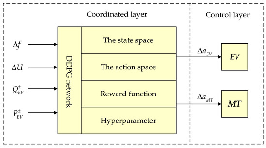 Considering MT and EV output power increment limiting constraints, a VF controller structure based on DDPG is proposed, as shown in Figure 6. The controller is composed of two layers: coordinate layer and control layer. The coordinate layer provides real-time regulation signal ∆A to the control layer according to the frequency deviation ∆f, voltage deviation ∆U, and the real-time boundary of output power of EV charging station, and then controls the output power of MT and EV to quickly suppress the frequency and voltage deviation.
