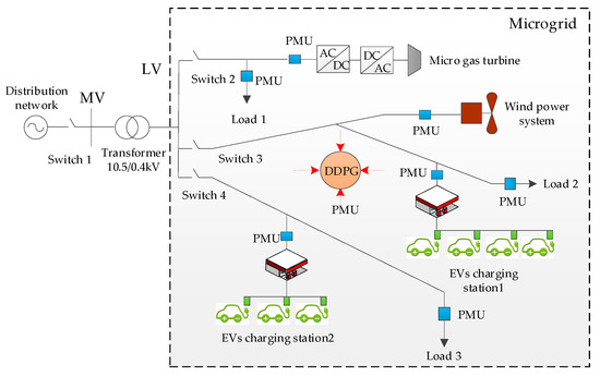 The structure of the microgrid is in Figure 4. The microgrid includes a MT, EVs, distributed wind power, and load.