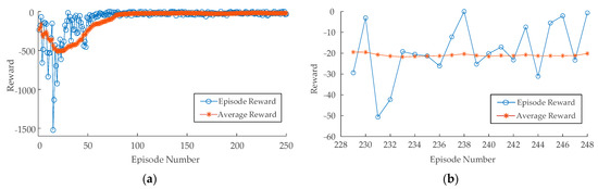 It can be seen that the agent basically converges after 80 iterations, and the system judges that the learning process has been completed and stops the training after 248 iterations. In this case, the average reward is −21.096 and the final award is 0.65307, which shows that the controller can complete the subsequent simulation at this time.