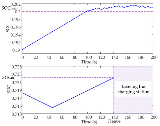 The first situation in Figure 10 shows that, when SOC < SOCrmin, the EV will be forced to enter the charging state. Only when SOC > SOCrmin can the EV participate in system regulation. The second situation in Figure 10 shows that, when the EV is close to the leaving time and SOC < SOCm, it will turn to the forced charging state to ensure that the SOC reaches the expected SOCm when leaving the charging station. In general, the changes in the SOC of EVs participating in the regulation of the microgrid are shown in Figure 11. The SOC of EVs will change in the constraint range.