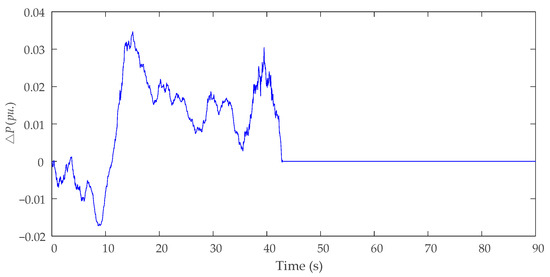 First of all, wind power disturbance is added to the islanded microgrid system, and wind mainly provides active power disturbances to the grid. In order to compare the adjusting speed of each controller, the wind power disturbance ends after 43 s. The disturbance setting is shown in Figure 12.