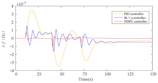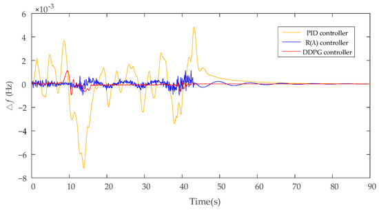 It can be seen from Figure 13 and Table 4 that, compared with the PID controller, the DDPG and R(λ) controller with the ability of online learning and experience playback can more effectively deal with the highly random disturbance. Under the wind disturbance, the frequency fluctuation of the islanded microgrid under the DDPG controller can be limited in 2 × 10−4 Hz, and the excellent rate can reach 98%, which is significantly better than the traditional controller. In addition, if only analyzed from the perspective of frequency control, the control strategy of DDPG and R(λ) controller in this paper possesses virtues of great control effect, smaller amplitude of frequency fluctuation, and faster regulation speed than a traditional controller. Furthermore, the regulation speed of DDPG controller is much faster than a R(λ) controller.