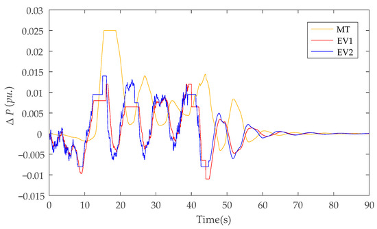 In the microgrid, there is a MT with capacity of 40 kW, a WT with capacity of 20 kW, an EV station1 with capacity of 16 kW, an EV station2 with capacity of 14 kW, and 60 kW ordinary loads. In addition, this paper assumes that the initial state of the microgrid is stable. Thus, when there is no external disturbance, the power output of MT, EV stations, WT, and conventional loads are always in balance. Therefore, in the following calculation examples, only the per-unit value of the power fluctuations of MT, EVs stations, WT, and load need to be considered.