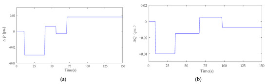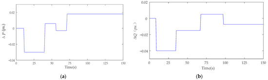 The fluctuation of load power is gentler than that of wind power, but the load change is abrupt and can cause fluctuations in active and reactive power at the same time. In this case, load power variations are set as ΔPL = −0.025 p.u during 10–40 s, ΔPL = 0.005 p.u during 40–55 s, ΔPL = −0.0025 p.u during 55–70 s, ΔPL = 0.015 p.u during 70–150 s, ΔQL = −0.04 p.u during 7.5–34 s, ΔQL = −0.015 p.u during 34–66 s, ΔQL = 0.005 p.u during 66–96 s, ΔQL = −0.0075 p.u during 96–150 s. The specific setting of load disturbance is shown in Figure 15.