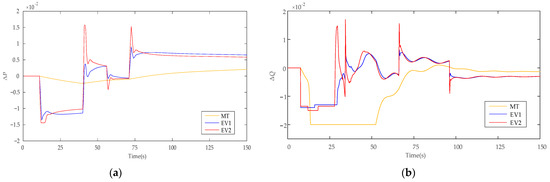 Furthermore, the power variations of each equipment are shown in Figure 18. The MT in the micro grid is used as the main source to maintain the stability of the VF amplitude of the microgrid, while the EV1 and EV2 as the slave sources are mainly responsible for the regulation of the active power of the microgrid and also participate in the regulation of the reactive power. In addition, due to the randomness of users, the output power boundary of EV charging stations is random, showing obvious jagged shapes.