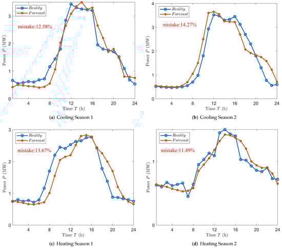 The cold, heat, and electrical demands of the park in a typical day were forecasted by examining and training the park’s 24-h usage data over the first two years to analyze the ideal economic scheduling. The test results of the artificial neural network training model are shown in Figure 3. Two days in each of the cooling and heating seasons were chosen for testing. Figure 4 depicts the cooling and heating season forecast results, and the equipment output analysis in the following section is likewise based on this data.