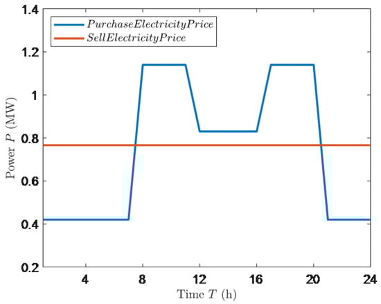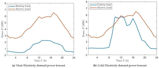 where denotes the gas internal combustion engine’s power generation at time t. The purchase of electricity from the grid and the sale of electricity to the grid at time t are represented by and , respectively. represents the power consumption of the Lithium bromide unit during make heating in time t; and reflect the power consumption of the endothermic chiller and centrifugal water-cooling unit, respectively; represents the power load of the user at time t.