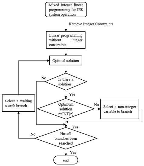 To solve the 0–1 mixed integer linear programming problem given for the integrated energy system [29], the branch and bound method is used, and the solving flow chart is illustrated in Figure 5. By removing the integer restriction, the branch and bound technique converts the integer programming problem into a noninteger programming problem and finds the best solution. For those subgroups whose boundaries exceed the known possible solution value, no additional branching is done after each branching. Many subgroups of the solution can be eliminated in this way, narrowing the search. This process is repeated until a feasible solution is identified that has a value that is not greater than the boundaries of any subset, yielding the optimal integer solution.