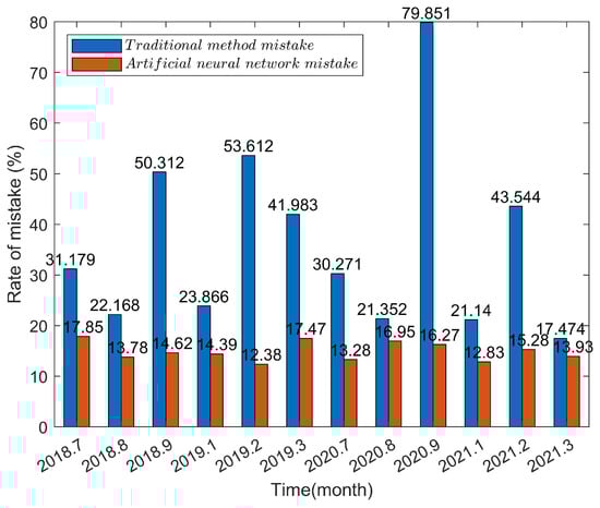 People typically utilize the strategy of picking average days to anticipate load in an integrated energy system, which is relatively straightforward but has low prediction accuracy. The article [31] Choose one day from the cooling and heating seasons as typical day data for prediction analysis, and assess the entire energy supply season with single-day data, which can only be used as a theoretical reference and cannot be used in real engineering. The article [32] Choose a few typical days for an analysis of a specific energy supply season, and the prediction findings are inaccurate. A suitable typical day technique [33] was chosen for testing in this work, and a typical day was chosen for examination in each month of the energy supply season. The difference between the calculated prediction results and the actual data from the energy station is compared to the artificial neural network technique employed in this study, demonstrating the accuracy and applicability of the current technology. Data from various types of energy supply in various years were chosen at random for analysis. The following Figure 7 shows the findings of the mistake analysis.