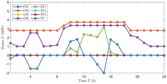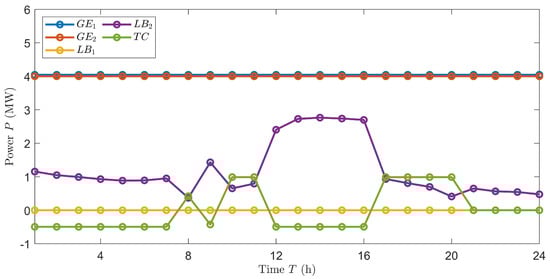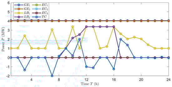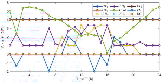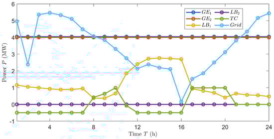 In the figure, represents the power of the water tank, positive represents output, negative represents input; represents the power created by the first internal combustion engine in a day on an hourly basis; represents the second internal combustion engine; represents the first lithium bromide refrigerator’s cooling or heating power per hour per day; represents the second one; represents the first centrifuge’s refrigeration power per hour each day; represents the second one; represents the third one; represents the power of the grid, a positive value indicates that electricity is being sold to the grid, while a negative value indicates that power is being purchased from the grid.