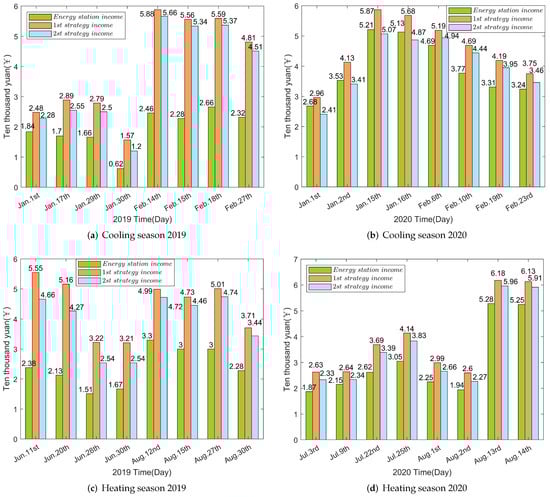 According to the above figure, the energy station’s major revenue comes from selling electricity and cooling and heating loads, while the main cost comes from natural gas use. As a result, too much generation during the 2019 cooling and heating seasons, when gas prices are higher, could result in reduced income. On 30 January 2019, for example, the user load was low, resulting in lower cooling and heat load revenue. Meanwhile, the gas internal combustion engine was set to work at nearly full capacity, resulting in more electrical generation and higher losses, ultimately ending in a day of a very low revenue. The power of gas internal combustion engines can be enhanced correctly to increase revenue due to the lower price of natural gas in the 2020 heating season. As indicated in the table, the energy station’s revenue has climbed considerably this season. For the 2020 cooling season, natural gas prices are continue to plummet. Electricity prices have declined, but at a slower rate than natural gas prices. As a result, choosing natural gas to run at a greater power level at this time would be more profitable, as evidenced by the comparison between 2 August and 13 August.