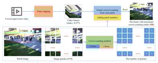 Because one frame contains 6 × 8 image patches, patch is controlled by the value of and . In the 6 × 8 grid, the 3 × 3 slide search box can move six times in row and move four times in line. Then, the crowd numbers of can be obtained, and can be obtained by ranking function .