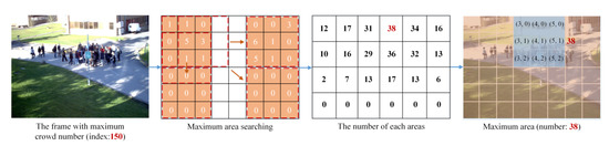 As the fourth sub-image in Figure 3 shows, the blue area, the area, contains nine smaller image patches. This area has the x-axis from and the y-axis from . The crowd number in is 38, which is the maximum value in frame with index 150. will be handled in the next section.