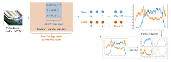 The th frame is divided into 48 smaller patches, which can be represented as . denotes the th patch in the th frame. After each frame is handled by crowd counting methods, the number of can be obtained. The whole number of can be obtained with Equation (1).