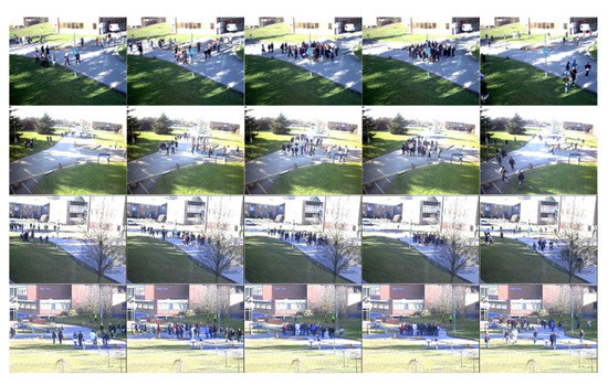 As shown in Figure 5, four rows represent four different views of the crowd. Each row has five images that include walking actions and gathering actions. The five images represent the sequential process of the crowd counting; people appeared from all sides, and then gathered in a local area, and finally dispersed. The aim of this work is to detect the gathering actions from the video frames.