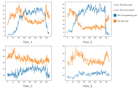 From Figure 6, it can be found that four views have the same curve tendencies. The blue curves (represent the crowd gathering area) increase and then decrease. The orange curves (represent the other areas) decrease and then increase. At the same time, between these two curves, it can be found that there are two points that can be regarded as the crowd gathering beginning time and the crowd gathering ending time. The crowd gathering beginning time happens when the blue curve increases and the orange curve decreases. The crowd gathering ending time happens when the blue curve decreases and the orange curve increases.