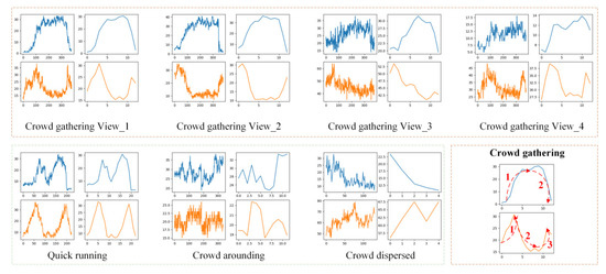 Figure 8 shows the comparisons among the crowd gathering action, quick running, crowd loitering, and crowd dispersal. In addition, the curves after filtering are also shown. The filtered results are more obvious to see the tendency of the corresponding action. In crowd gathering views 1–4, the blue curves increase and then decrease. This work calls the increasing step 1 and the decreasing step 2. Correspondingly, the orange curves have three steps at the same time, step 1, step 2, and step 3. When the blue curve is in step 1, the orange curve will go through step 1 and step 2.