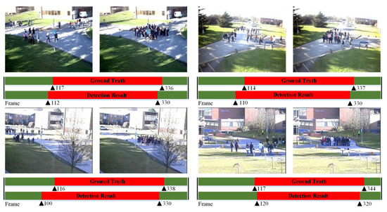 This work also shows the visualization results of DGG for the PETS2009 dataset, which can be found in Figure 9. The four groups of experimental video frames denote the four different views. The red bars indicate the ground truth and the detection result of DGG, such as the upper-left group, the ground truth is from the 117th frame to the 336th frame, and the detection result is from the 112th frame to the 330th frame. The closer the range of numbers on the two red bars, the higher accuracy of the DGG.