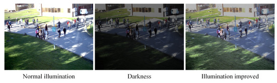 This work also considers some extreme conditions, especially the darkness condition. Figure 10 shows the normal illumination, darkness, and the illumination-improved images. The normal illumination image was selected from the PETS2009 dataset. After reducing the brightness of the normal illumination image, the image with darkness can be obtained. It was found that some visual clues were hidden in the darkness. To solve the crowd gathering detection problem under such extreme conditions, image illumination-improved methods [42,43] were researched. The two methods can recover the illumination information to some extent. This step is considered data pre-processing.