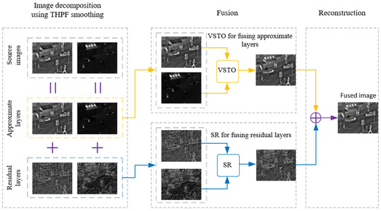 Overview of image fusion method using THPF-based decomposition and VSTO-SR fusion rule (tested on ‘Road’).