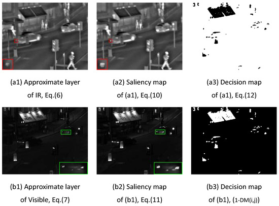 where is the maximum filtering. = 3 denotes the filtering window with the window size (2r + 1)(2r + 1), typically r = 1. and are filtered images serving as the visual saliency maps (VSM) of and , respectively. Figure 3 illustrates the visual saliency maps of approximate layers for IR and visible images, as shown in Figure 3(a2,b2), respectively. Obviously, objects/regions in Figure 3(a2,b2) are easier for identification than the ones in Figure 3(a1,b1) (see comparisons in red and green boxes), respectively.