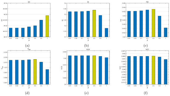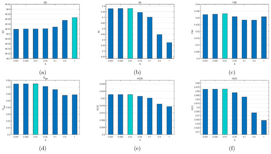 Influence of parameter on objective metrics. Average values of each metric are obtained via the testing dataset. From left to right for each metric, = 0.001, 0.005, 0.01, 0.05, 0.1, 0.5, and 1. (a) SD, (b) MI, (c) FMI, (d) Q, (e) NCIE, (f) NCC.