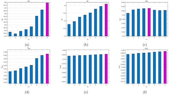 Influence of parameter on objective metrics. Average values of each metric are obtained via the testing dataset. From left to right for each metric, = 1, 2, 3, 4, 5, 6, 7, and 8. (a) SD, (b) MI, (c) FMI, (d) Q, (e) NCIE, (f) NCC.