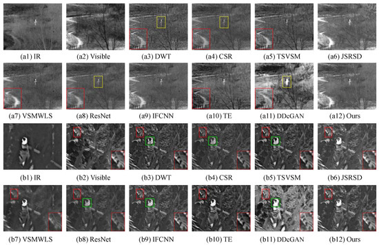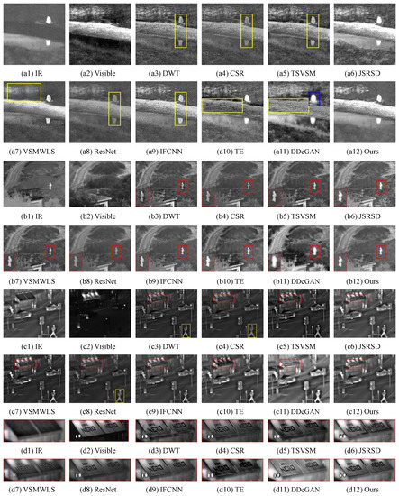 For ‘Sandpath’ (S4, Figure 10(a1–a12)), it is self-evident that the results of DWT, CSR, and ResNet cannot highlight the person due to low brightness (see the yellow rectangle). DWT, CSR, TSVSM, VSMWLS, ResNet, TE, and DDcGAN are not able to merge the visible information well (see the red rectangle). Seeing the top right-hand corner of Figure 10(a6), JSRSD encounters the blocking artifacts whereas important targets/regions were well integrated. Although IFCNN achieves a good performance, our method is visually more pleasing than IFCNN.
