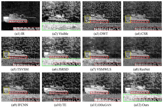 To provide the clear outputs of the test image, we display the fusion results of ‘Tank’ (S6) in a larger size. For ‘Tank’, Figure 11(a1) clearly provides the thermal radiation information of targets (e.g., the tank), but there is no sign of detail information of the trees and the grass. In contrast to the IR image, the visible image (Figure 11(a2)) is capable of providing rich details and textures of the trees and grass, whereas has no abundant detail information of ‘Tank’. For the rear of ‘Tank’ (see the yellow rectangle), DWT, CSR, TSVSM, VSMWLS, ResNet, and IFCNN suffer from contrast distortions, meanwhile JSRSD, TE, DDcGAN and our method are free of this defect. Furthermore, the wheels of ‘Tank’ (see the close-up views in red boxes) have black stains in eight other methods except DDcGAN and our method. For the grass (see the green rectangles), the fusion results of JSRSD and our method look like more clearer and natural than the ones of the rest methods. Therefore, our THPF-VSTO-SR method is effective to integrate the significant and complementary information of IR and visible images into a well-pleasing image.
