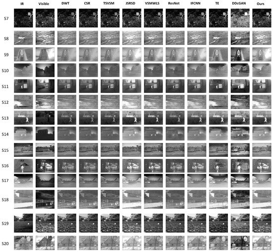 In addition, to comprehensively prove the effectiveness of our method, more experiments of 14 other image pairs (S7–S20) are carried out. The performances of various methods on 14 other image pairs are shown in Figure 12. Through comparisons via the experimental results, JSRSD, VSMWLS, IFCNN, TE, DDcGAN and our THPF-VSTO-SR method can achieve good visual performances. Section 5.2 will give the objective evaluation quantitatively.