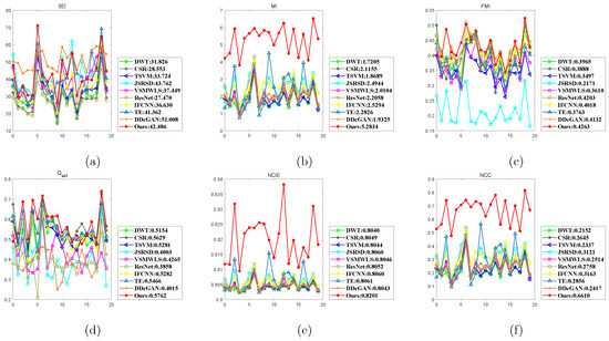 Quantitative comparisons of 4 metrics using various representative methods (DWT [17], CSR [29], TSVSM [8], JSRSD [30], VSMWLS [27], ResNet [32], IFCNN [36], TE [44], and DDcGAN [37]) on 20 IR and visible image pairs. For all methods, the average values are provided in the legend. From 0 to 19: S1–S20. (a) SD, (b) MI, (c) FMI, (d) Q, (e) NCIE, (f) NCC.
