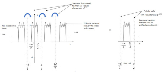 Note that: (for a standard rectangular pulse train), which explains how to recover (reconstruct) a pulse train by means the Fourier series, as shown in Figure 1 and explained in [39,40] (see the subsection on periodic pulse and impulse trains in [39]). By adding the Floquet contribution , we obtain the definition (see Figure 1).