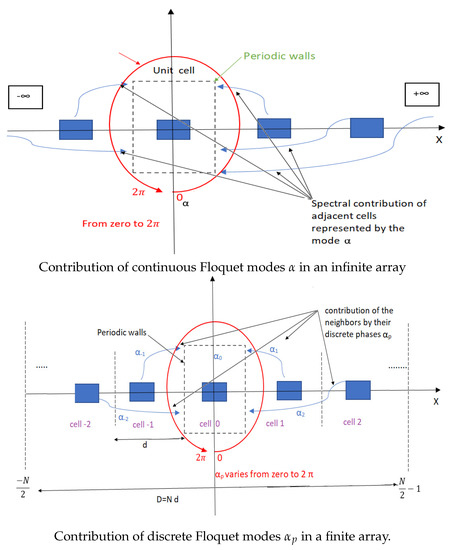 As previously explained in [4,6], the interactions between cells in the spectral domain for periodic finite arrays are governed by a discrete phase law such that (with ), which comes from a rule-of-three math reasoning.