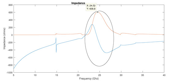 Impedance variation against frequency band around 24 GHz: obtained by the MoM-GEC method.