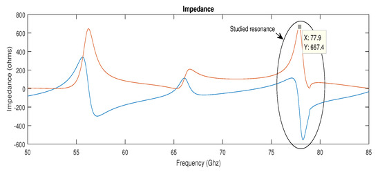 Impedance variation against frequency band around 77 GHz: obtained by the MoM GEC method.