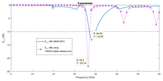 -parameter (dB) variation against frequency band around 24 GHz: a comparison between the MoM-GEC and a MATLAB tool (see references [41,42]).