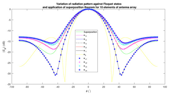 Variation of radiation pattern against Floquet states and application of superposition theorem for 10 elements of antenna array (uni-dimentionnal configuration) at 77 GHz: obtained by the MoM-GEC method.