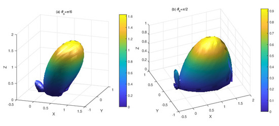 Therefore, the radiation pattern response for a small 2 × 4 antenna array is proposed based on the Floquet analysis (via the superposition theorem). Let us assume that the radar antenna system operates at 77 GHz with a bandwidth of 700 MHz. The following Figure 1 of [35] shows the spatial-radiation pattern of the resulting planar antenna using the superposition theorem of 2 × 4 Floquet radiation examples. Then, the sum of the discrete Floquet radiation patterns assigned to the FMCW radar permits the prediction of the global spatial-radiation pattern (what is called spatial modulation). A good comparison of the given numerical radiation pattern and the radiation obtained by patch array and cosine array is presented in Figure 3 of [35]. After validating the FMCW radar, we propose to evaluate the approach for a very large number of elements that uses the same frequency band at 24 and 77 GHz (for example, a lattice of 100 elements). Figure 6 gives an example of the superposition theorem (or a spatial modulation) for a large array to generate a spatial radiation pattern through the addition of the radiation patterns of Floquet states. After that, Figure 4 of [35] presents the variation of the spatial-radiation pattern (obtained using Floquet analysis) in the function of steering angles for 100 antenna elements that are distributed in a uni-dimensional configuration (for 5G application). In the same way, Figure 7 and Figure 5 of [35] show the variation of the 3D radiation pattern against different steering angles that are described with , and , in Cartesian coordinates and (u,v) space, respectively. Following the same study, Table 1 and Table 2 show the directivity values for each Floquet state and the superposition theorem (in the two cases of the FMCW radar and the 5G application), with two different steering angles and at the frequencies of 24 GHz and 77 GHz. From Figure 1 of [35] and Figure 6, we can see that the radiation patterns are nearly identical and verify the condition where the directivities are similar for both the Floquet states and the superposition theorem. This is why, in both Table 1 and Table 2, we find that all directivity values are identical (for the Floquet states as well as for the superposition), even when we change the steering angle. Knowing that generally, the directivity value close to 20 dB satisfies a narrow beam angle of about 20 degrees, as shown graphically in Figure 7a.