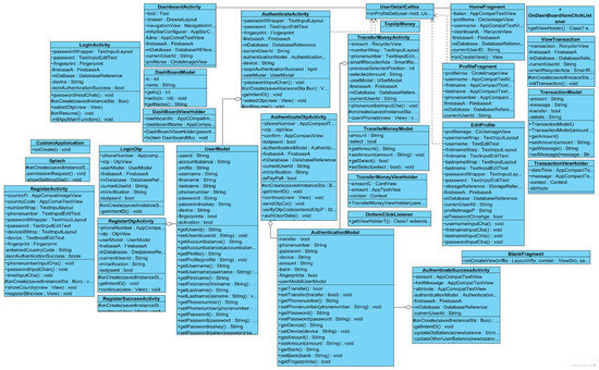 The implementation requirements depend on the analysis of the system. The unified modeling language (UML) is used to draw and visualize the architectural structure of the projects. The UML is a unique, standardized representation. In a system review, a developer may use the case diagram to display all the participants taking part in the project. Figure 5 presents the class diagram of the Zamwallet.
