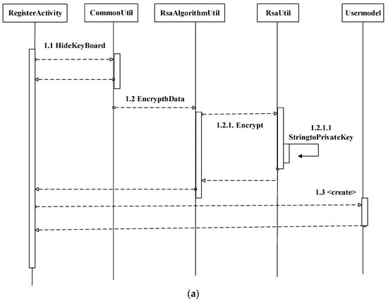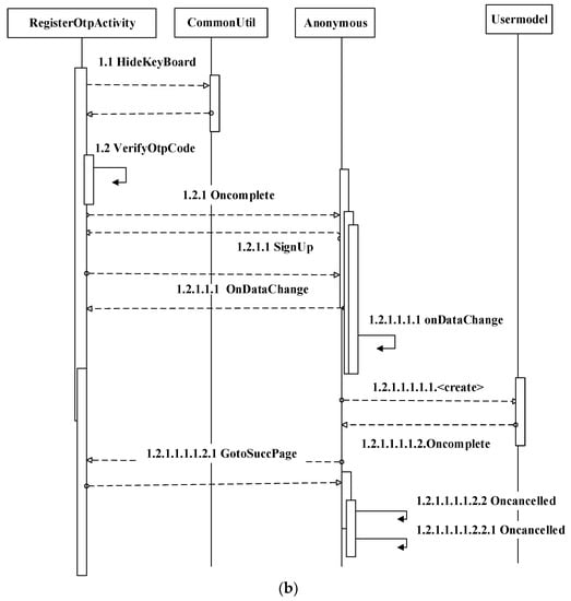 (a): Register activity of proposed method and (b): Register OTP activity of proposed method. In (a), Step 1.1: The RegisterActivity will hide the keyboard in the CommonUtil (where util functions are stored) and return a message to the RegisterActivity. Step 1.2: The EncrptData function is the process in RsaAlgorithmUtil, which waits for the user input data to process the message. Step 1.2.1: The user input data encrypts into RsaUtil. Step 1.2.1.1: Then, user input data encrypt using RSA string to public key in RSAUtil and send return message from the RsaAlgorithmUtil to RegisterActivity. Step 1.3: Finally, the register activity sends a message to the UserModel to create an account and wait for the RegisterActivity to respond. In (b), Step 1.1: The RegisterOtpActivity will hide the keyboard in the CommonUtil and return a message to the RegisterOtpActivity. Step 1.2: The verifyOtp code starts, ends with RegisterOtpActivity, and waits for the response. Step 1.2.1: Once OTP is verified, the onComplete function then waits for the anonymous (where Utils functions are stored) response to process the request. Step 1.2.1.1: Anonymous responds to the RegisterOtpActivity request and confirms that sing up has been successful. Step 1.2.1.1.1: Then, RegisterOtpActivity sends request ondataChange (real-time database) to anonymous. Step 1.2.1.1.1.1: The onDataChange function starts and ends with the same lifeline (i.e., anonymous). Step 1.2.1.1.1.1.1: Then, anonymous sends a request to the UserModel to create a user profile in the real-time database. Step 1.2.1.1.1.1.2: UserModel sends response to the anonymous onComplete response. Step 1.2.1.1.1.1.2.1: Then, anonymous sends a response to the RegisterOtpActivity for successful registration.