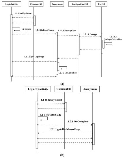 (a): Login activity of proposed method and (b): Login OTP activity of proposed method. In (a), Step 1.1: The LoginActivity will hide the keyboard in the CommonUtil and return to the LoginActivity. Step 1.2: The signing starts and ends with LoginActivity and waits for the response. Step 1.2.1: Then, loginactivity sends a request onDataChange to anonymous. Step 1.2.1.1: Then, anonymous sent a request to decrytData into the RsaAlgorithmUtil. Step 1.2.1.1.1: User input data decrypt and sent to the RsaUtil. Step 1.2.1.1.1.1: Then, user input data decrypt using RSA string to private key in RSAUtil and send a return message to the RsaAlgorithmUtil to anonymous. Step 1.2.1.2: Then, anonymous sends a response to the LoginActivity and goes to the login page. Step 1.2.1.3: Finally, LoginActivity onCancelled. In (b), Step 1.1: The LoginOtpActivity will hide the keyboard in the CommonUtil and return to the LoginOtpActivity. Step 1.2: The verifyOtp code starts and ends with LoginOtpActivity and waits for the response. Step 1.2.1: Once OTP is verified, then the onComplete function waits for the anonymous response to process the request. Step 1.2.1.1: anonymous responds to the LoginOtpActivity and goes to the DashboardPage.