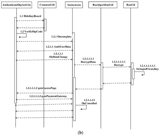 (a): Authentication activity of proposed method, (b): Authentication OTP activity of proposed method, and (c): Authentication successful activity of proposed method. In (a), Step 1.1: The AuthenticateActivity will hide the keyboard in the CommonUtil and return to the AuthenticateActivity. Step 1.2: AuthenticateActivity sends a message to the AuthenticationModel to create an account and waits for AuthenticateActivity to respond. Step 1.3: Finally, AuthenticationModel creates and sends a response to AuthenticateActivity. In (b), Step 1.1: The AuthenticateOtpActivity will hide the keyboard in the CommonUtil and return a message to the AuthenticateOtpActivity. Step 1.2: The verifyOtp code starts, ends with AuthenticateOtpActivity, and waits for the response. Step 1.2.1: Once OTP is verified, the onComplete function waits for anonymous response to process the request. Step 1.2.1.1: Anonymous sends a response to AuthUserData and sends it back to the AuthenticateOtpActivity. Step 1.2.1.1.1: Then, AuthenticateOtpActivity sends a request ondataChange to anonymous. Step 1.2.1.1.1.1: Then, anonymous sends a request to decrytData into the RsaAlgorithmUtil. Step 1.2.1.1.1.1.1: User input data decrypted and sent to the RsaUtil. Step 1.2.1.1.1.1.1.1: Then, user input data decrypted using RSA string to private key in RSAUtil and sends a return message to the RsaAlgorithmUtil to anonymous. Step 1.2.1.1.1.2: Then, anonymous sends a response to the AuthenticateOtpActivity and goes to the SuccessPage. Step 1.2.1.1.1.3: Once AuthenticateOtpActivity succeeds, the request sent to the PaymentGateway. Step 1.2.1.1.1.4: Finally, AuthenticateOtpActivity onCancelled. In (c), Step 1.1: The UpdateTransactionDb will start and return a message to the AuthenticateSuccessActivity. Step 1.1.1: The AuthenticateSuccessActivity creates an amount in the TransactionModel and sends it back to the AuthenticateSuccessActivity. Step 1.1.2: The updateDbBalance starts and ends with AuthenticateSuccessActivity and waits for the response. Step 1.1.2.1: Then, AuthenticateSuccessActivity sends a request ondataChange to anonymous. Step 1.1.2.1.1: Then, onCancelled starts and ends with anonymous and sends a request to the AuthenticateSuccessActivity. Step 1.1.3: The AuthenticateSuccessActivity creates an amount in the TransactionModel and sends it back to the AuthenticateSuccessActivity. Step 1.1.4: The updateDbBalance starts and ends with, AuthenticateSuccessActivity and waits for the response. Step 1.1.4.1: Then, AuthenticateSuccessActivity sends a request ondataChange to anonymous. Step 1.1.4.1.1: Then, onCancelled starts and ends with anonymous and sends a request to the AuthenticateSuccessActivity. Step 1.1.5: Then, onComplete request sent to anonymous. Step 1.1.5.1: Then, anonymous sends UpdateOtherUserBalance to the AuthenticateSuccessActivity. The next steps process the same flow.