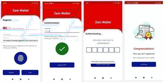 The proposed application has two process register activities and a register OTP activity. Creating an account is the first step in using this application. The method of registration is quite simple. Initially, the user must complete all the fields needed in the registration form. The registration form consists of four fundamental categories of authentication: password, device ID, fingerprints, and OTP. Then, users will submit the form by clicking the register button. The backend controller of the registration page will ensure that all fields needed are correct. If not, the program shows the user an error message indicating the precise details of the error, and the user is re-directed to the registration page. In the proposed Zamwallet, the user passwords are encrypted using the full form of the RSA (RSA) algorithm for security. In the following figure, the hide keyboard function is used to keep the virtual keyboard to prevent autocorrect for spelling mistakes; here, the hide keyboard function is used for security. Encrypted data is the process of encrypting user input data using an RSA string to the public key and finally creating a user account in register activity. After input, an OTP verification code will be sent to the registered phone number of the user. If all the information is correct, the user is automatically directed to the default page to log in as a member. The registration is shown in Figure 6a, while Figure 6b shows the OTP activity.