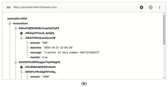 Overview of real-time database activities. (a): User information on Firebase database and (b): user transaction details on Firebase database.