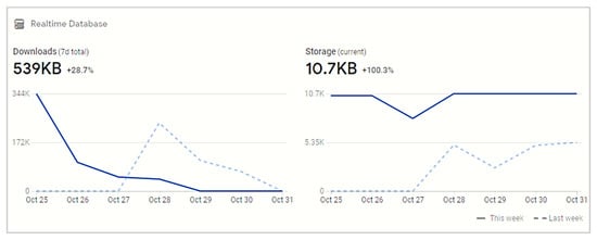 As Figure 17a shows, the user device identity (ID) is encrypted with base64. However, Firebase real-time is very secure with support from Google. The user password is encrypted with RSA. Full form (NIST) has been proposing a minimum of 2048-bit keys for RSA since 2015, an upgrade from the accepted 1024-bit minimum recommendation from at least 2002 onwards [56,57]. RSA 2048 key is the most secure [58,59]. To secure interactions with the webserver, a 2048-bit RSA key and a self-signed SSL certificate are generated to encrypt all the full form (HTTPS) communications [60,61,62]. Figure 18 shows the performance for Zamwallet, and Figure 19 shows the real-time database overview.