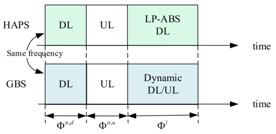 The asynchronous transmission protocol configuration of different layers will introduce cross-link interference. Cross-link interference includes downlink to uplink interference caused by BS in neighbor cells and uplink to downlink interference caused by users in neighbor cells. Because the transmission power of the HAPS node is much greater than that of GBS, the interference from the HAPS node to neighbor cells is the major reason for the decline of system performance. To effectively support dynamic TDD in an integrated system and mitigate cross-link interference, this paper designs the transmission protocol as shown in Figure 2. The transmission protocol combines power control and time slot resource configuration. HAPS divides each subframe into two parts, one is called a normal subframe, and the other one is called LP-ABS. To mitigate HAPS-to-GBS interference, the HAPS node and GBS configure synchronous uplink and downlink slots on the normal subframe. In addition, to provide better flexibility to support the asymmetry of data flow, each GBS dynamically configures the proportion of uplink and downlink slots on the dynamic subframe. In this case, the asynchronous transmission configuration between GBS may lead to serious interference from the HAPS node to GBS. HAPS configure downlink transmission with low transmission power P on LP-ABS in order to reduce unnecessary interference and utilize spectrum resources efficiently.