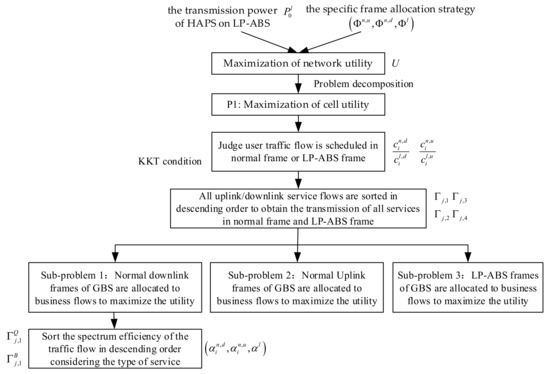Firstly, this paper determines the configuration of the transmission protocol by maximizing the expected throughput of the system. Secondly, for diversified services, this paper introduces utility functions to characterize the satisfaction of services. Finally, the traffic flow resource allocation problem in the integrated system is modelled as a utility maximization problem, which can be decomposed into an independent cell utility maximization problem. By optimizing the transmission power on LP-ABS and the resource allocation of each traffic flow, the network utility is maximized under resource constraints. Figure 3 shows the flow and relationships between the different problems and subproblems of the algorithm design.